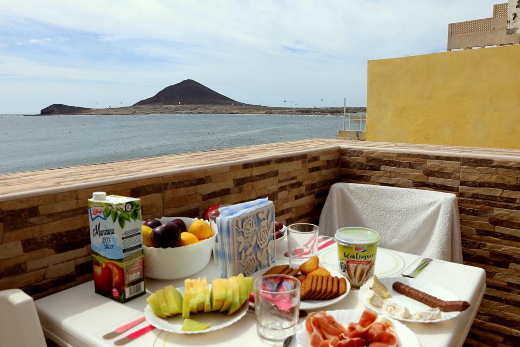 Мы не стали скромничать и устроили гнездо над самым океаном. Брызги прибоя прилетали к нам через открытые окна! Но в этот момент море тихое, ласковое. Выбравшись на берег после утреннего освежающего заплыва – лакомимся испанскими вкусностями.